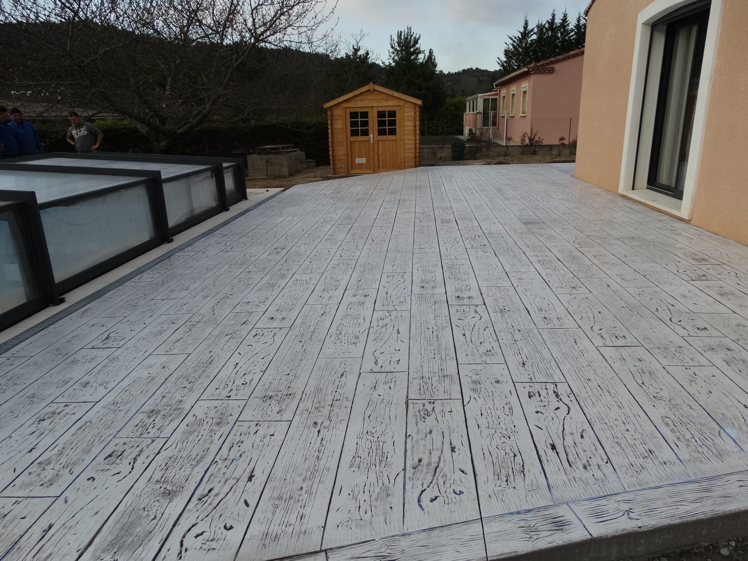 Grâce à son système d’imitation parfaite de paves, carrelages, pierres et bois, etc. … le béton imprime ou marque aménage tous vos intérieurs et extérieurs de façon durable dans le temps.