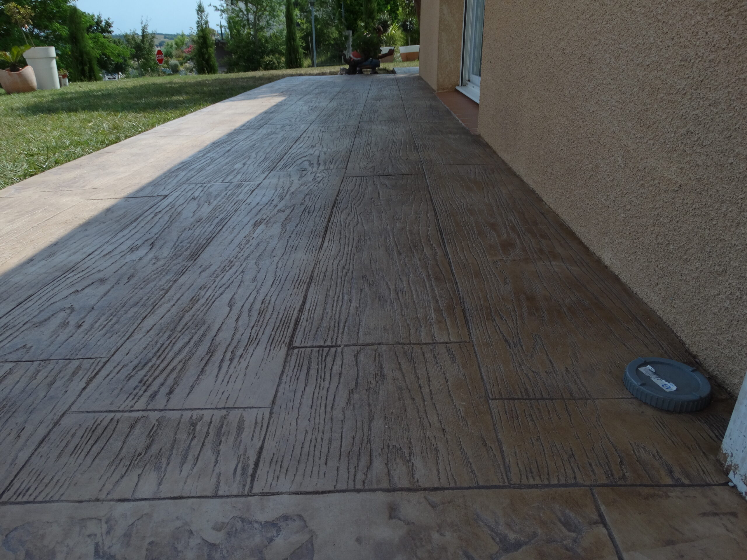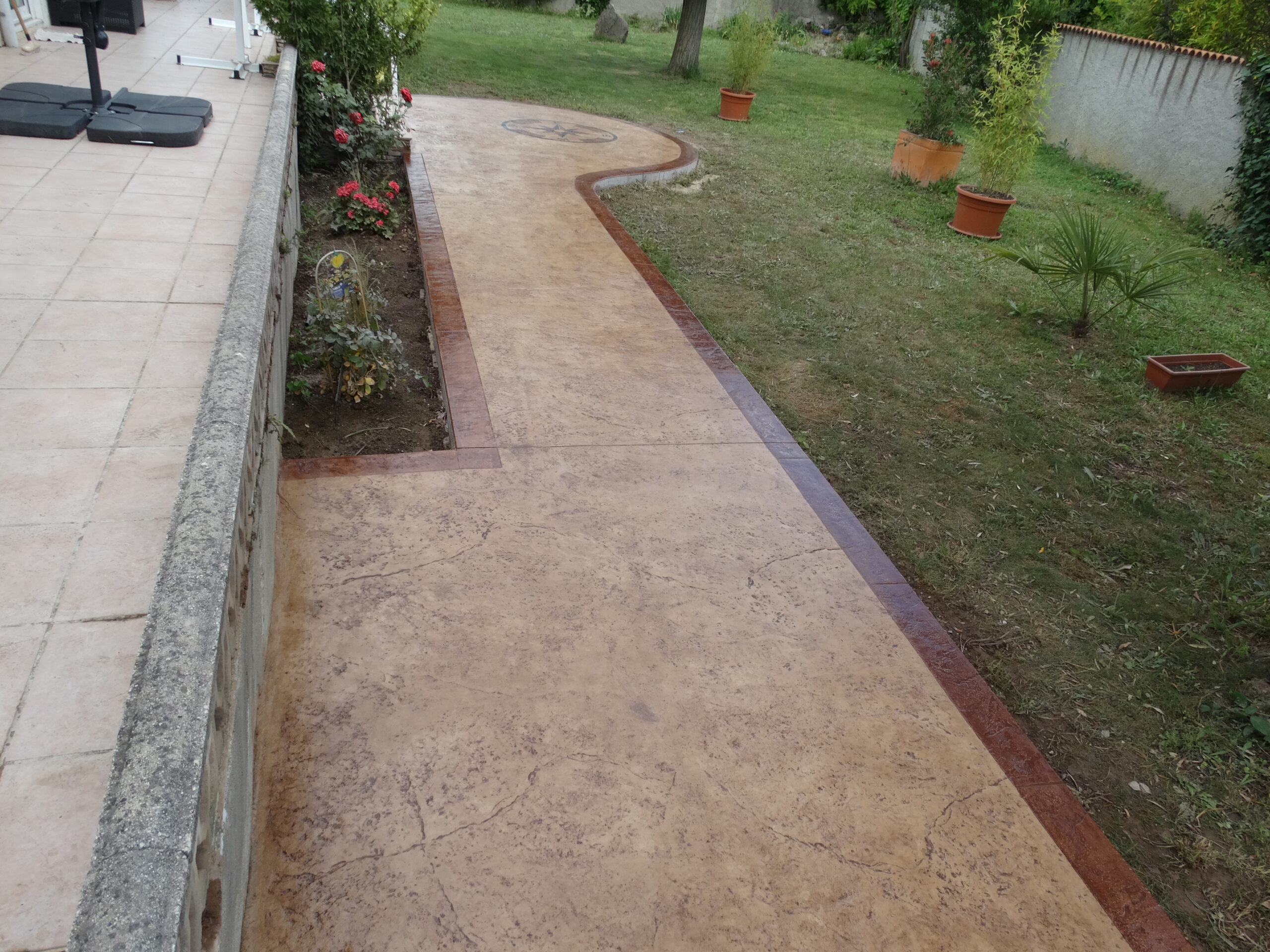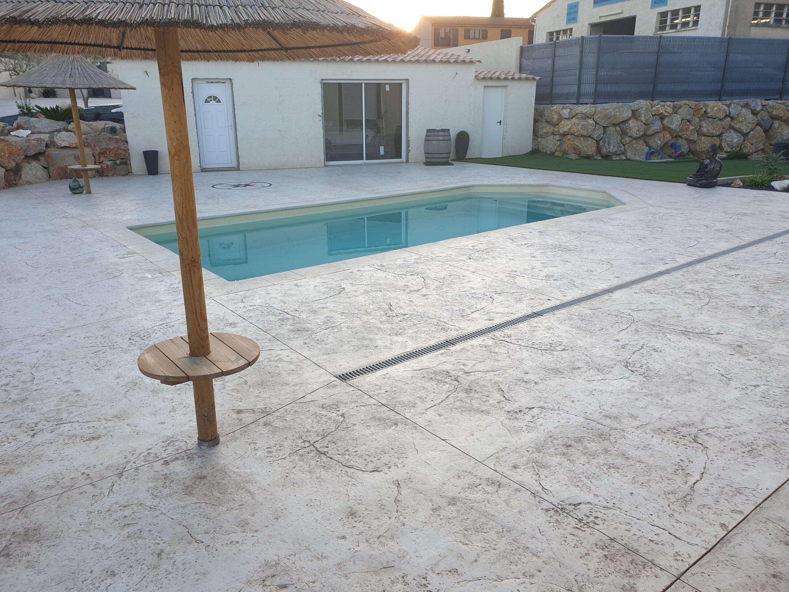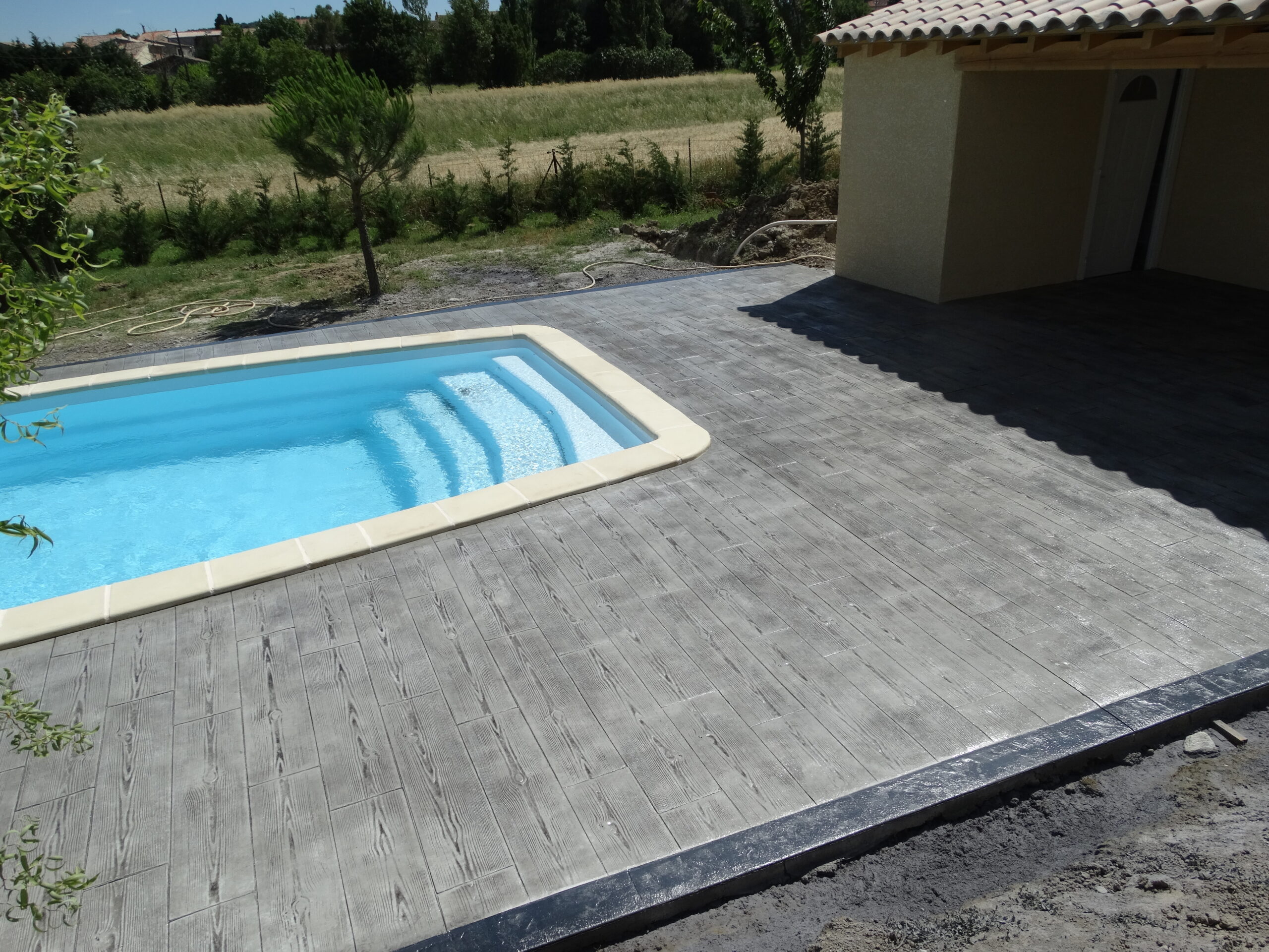 Grâce à son système d’imitation parfaite de travertin, carrelages, pierres et bois, etc. … le béton imprime ou marque aménage tous vos extérieurs de façon durable dans le temps.